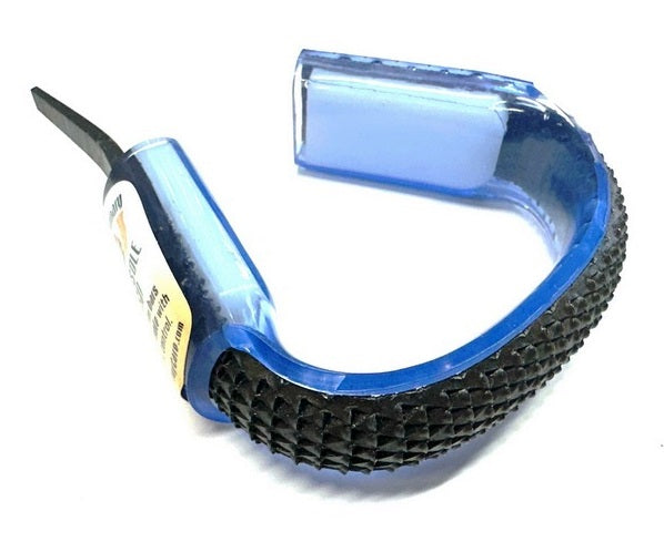 Curved rasp-tooth tool for removing excess growth from sole and bars. Clear vinyl rubber handle for secure “safe grip.” Tine doubles as a hoof pick for clearing debris from the commissures of the frog.